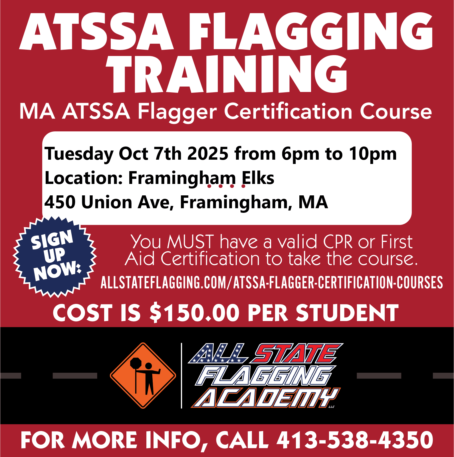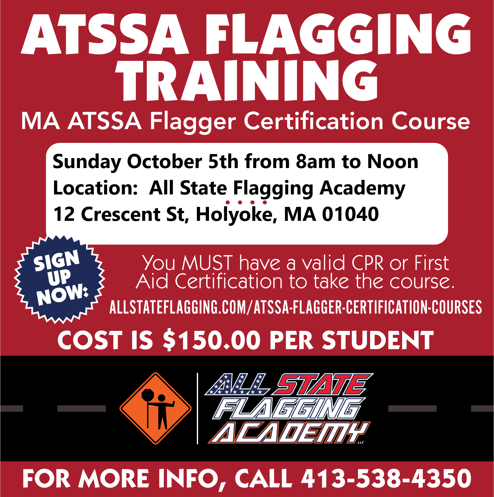 MA ATSSA Flagger Certification Course-Holyoke, MA Sunday October 5th 2025 8am to 12 noon
