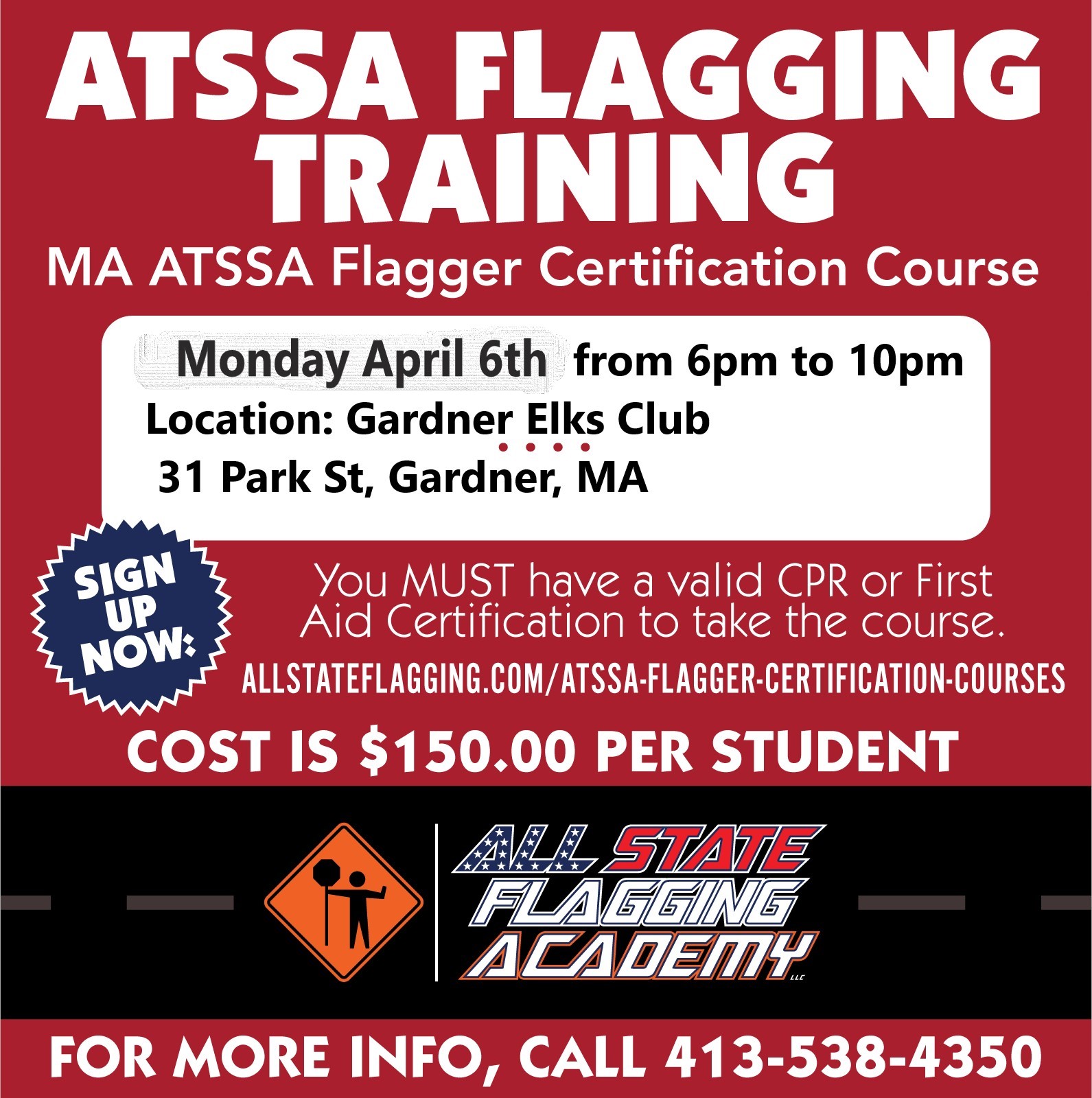 This class is to become a ATSSA MA Certified Flagger. This course will allow you to work for construction companies in the state of MA. ATSSA is the American Traffic Safety Services Association. All State Flagging Academy is a recognized MA DOT trainer. All students must have a CPR card or First Aid Card to complete the class. For more information, email [email protected] or call 413-313-3485. The class is limited to 2