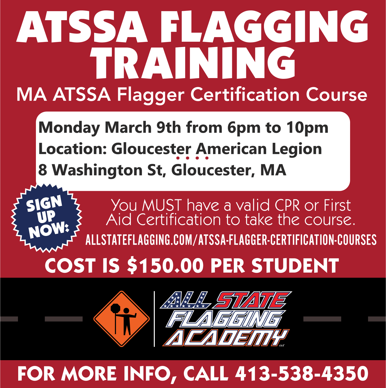 MA ATSSA Flagger Certification Course-Gloucester MA Monday March 9th, 6pm to 10pm