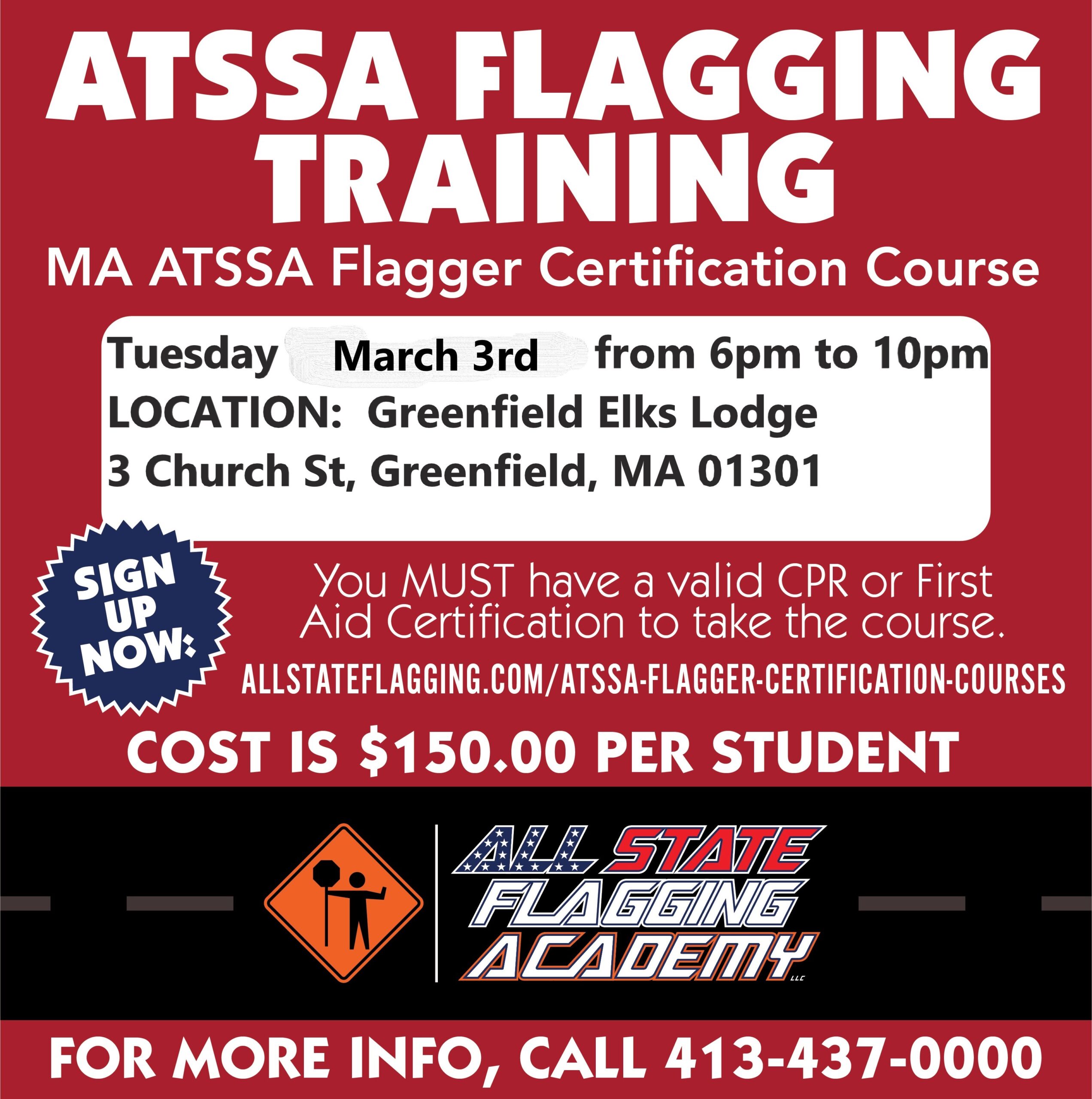 This class is to become a ATSSA MA Certified Flagger. This course will allow you to work for construction companies in the state of MA. ATSSA is the American Traffic Safety Services Association. All State Flagging Academy is a recognized MA DOT trainer. All students must have a CPR card or First Aid Card to complete the class. For more information, email [email protected] or call 413-313-3485. The class is limited to 2