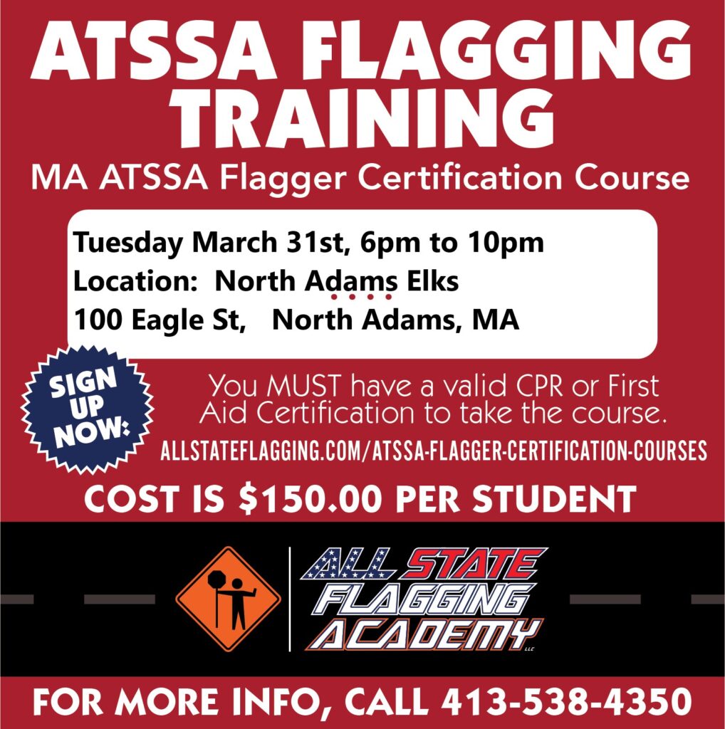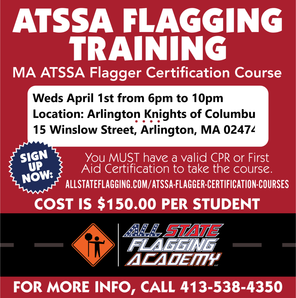 This class is to become a ATSSA MA Certified Flagger. This course will allow you to work for construction companies in the state of MA. ATSSA is the American Traffic Safety Services Association. All State Flagging Academy is a recognized MA DOT trainer.  All students must have a CPR card or First Aid Card to complete the class. For more information, email [email protected] or call 413-313-3485. The class is limited to 20 students.  First Aid Cards can be obtained through the American Red Cross online.  https://www.redcross.org/take-a-class/cart/checkout#latitude=42.1070383&longitude=-72.6203675&searchtype=class&zip=west+springfield%2C+ma&start=7&cgid=online-safety-classes