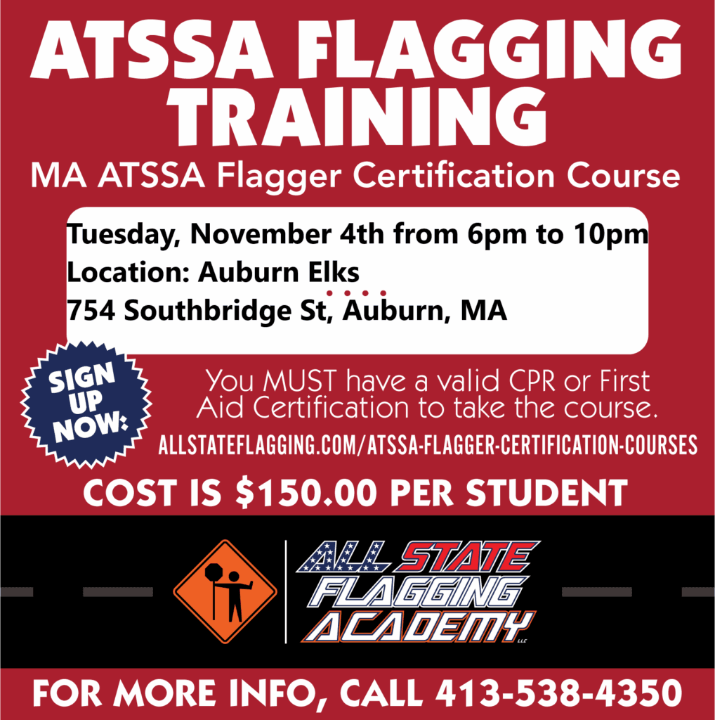 This class is to become a ATSSA MA Certified Flagger. This course will allow you to work for construction companies in the state of MA. ATSSA is the American Traffic Safety Services Association. All State Flagging Academy is a recognized MA DOT trainer. All students must have a CPR card or First Aid Card to complete the class. For more information, email [email protected] or call 413-313-3485. The class is limited to 2