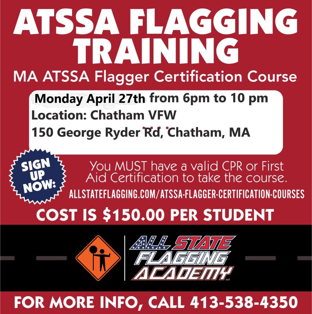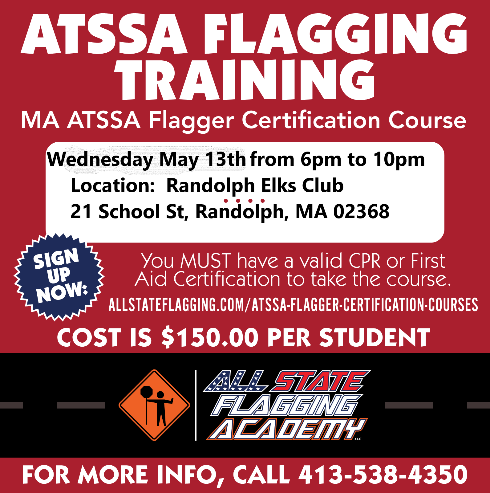 MA ATSSA Flagger Certification Course-Randolph, MA Monday May 13th 6pm to 10pm Randolph Elks