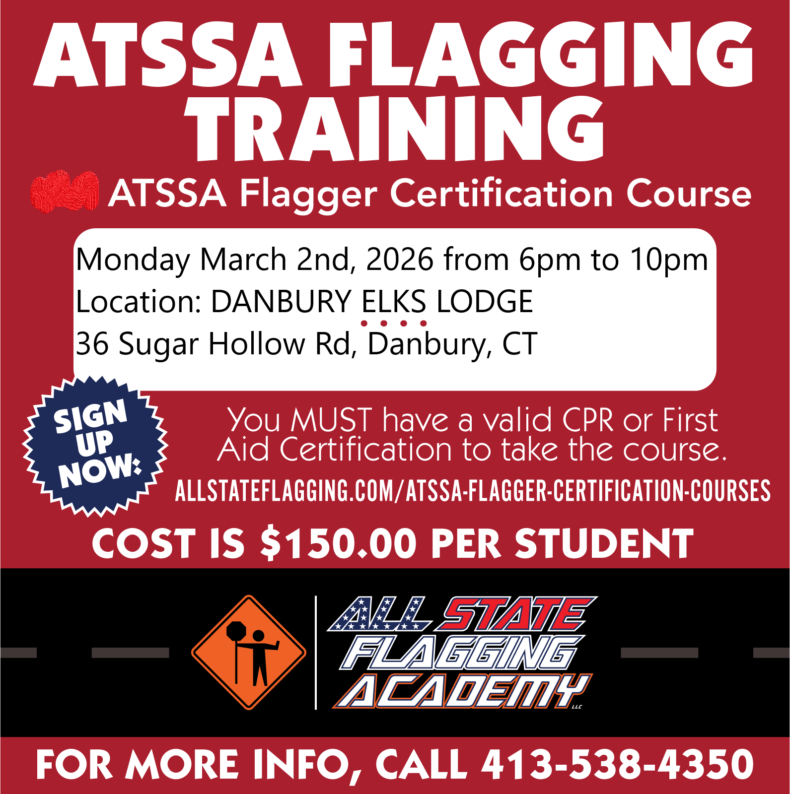 National ATSSA Flagger Certification Course-Danbury, CT Monday March 2nd, 6pm to 10pm