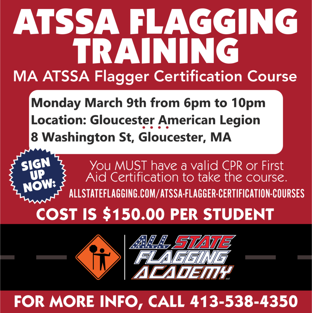 This class is to become a ATSSA  Certified Flagger. This course will allow you to work for construction companies in the state of CT, RI, NH, and NY.  ATSSA is the American Traffic Safety Services Association. All State Flagging Academy is a recognized MA DOT trainer.  All students must have a CPR card or First Aid Card to complete the class. For more information, email [email protected] or call 413-313-3485. The class is limited to 20 students.  First Aid Cards can be obtained through the American Red Cross online.  https://www.redcross.org/take-a-class/cart/checkout#latitude=42.1070383&longitude=-72.6203675&searchtype=class&zip=west+springfield%2C+ma&start=7&cgid=online-safety-classes