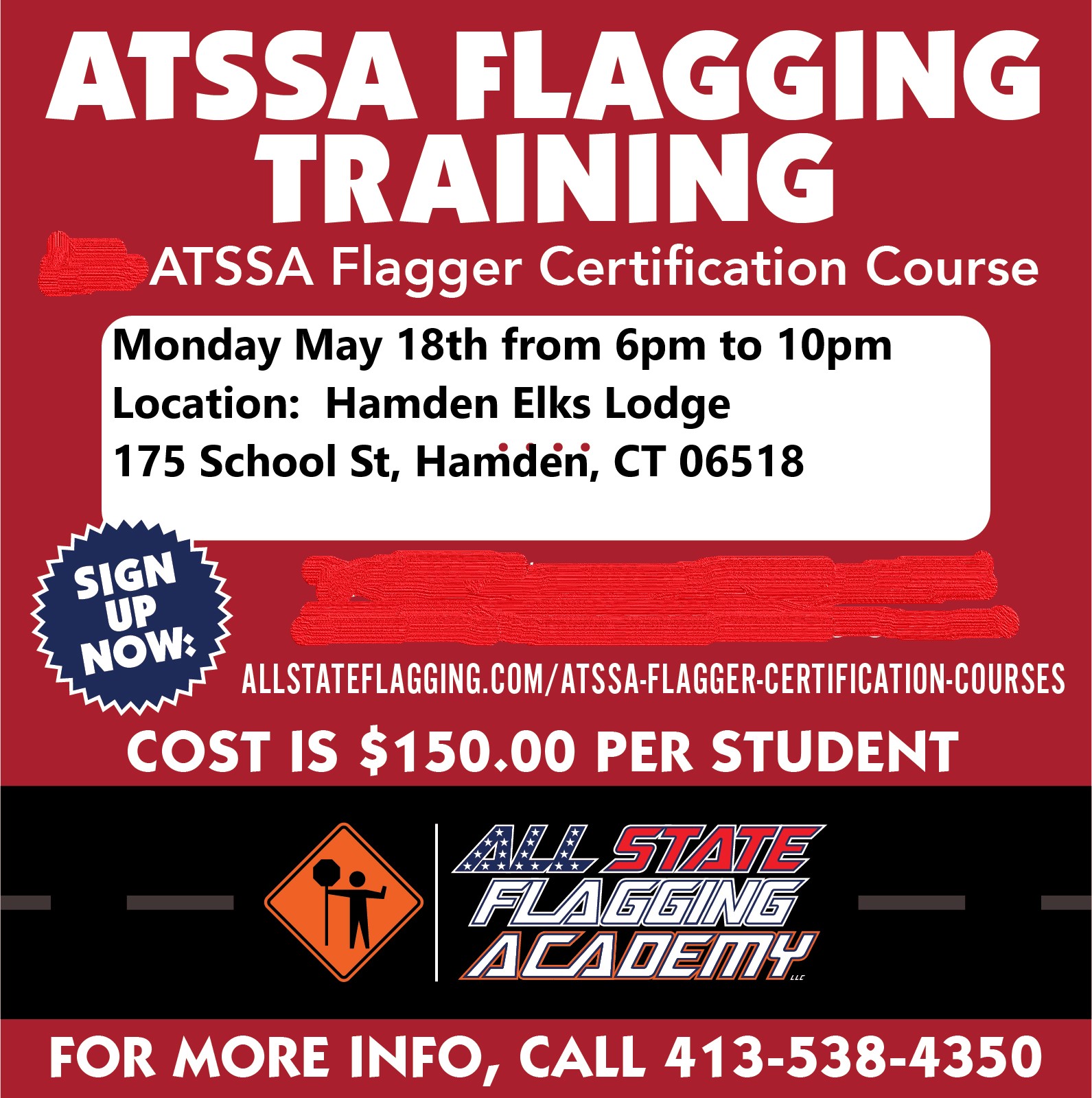 This class is to become a ATSSA Certified Flagger. This course will allow you to work for construction companies in the state of CT, RI, NH, and NY. ATSSA is the American Traffic Safety Services Association. All State Flagging Academy is a recognized MA DOT trainer. For more information, email [email protected] or call 413-313-3485. The class is limited to 2