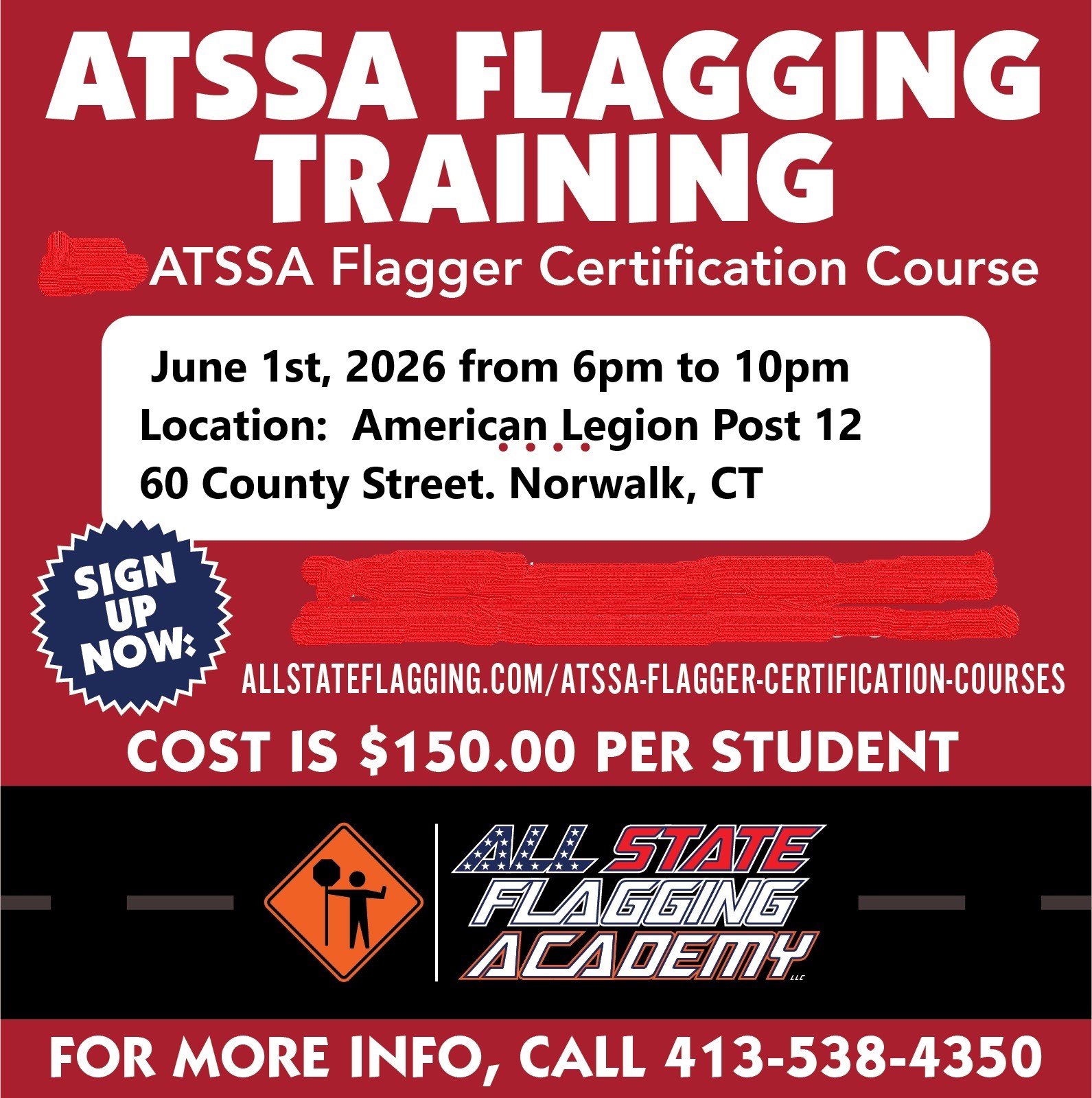 This class is to become a ATSSA Certified Flagger. This course will allow you to work for construction companies in the state of CT, RI, NH, and NY. ATSSA is the American Traffic Safety Services Association. All State Flagging Academy is a recognized MA DOT trainer. For more information, email [email protected] or call 413-313-3485. The class is limited to 3
