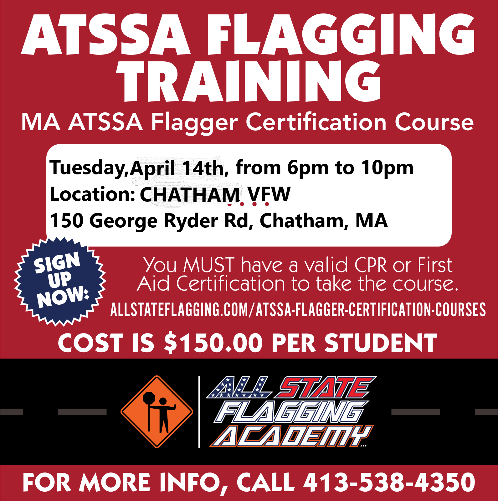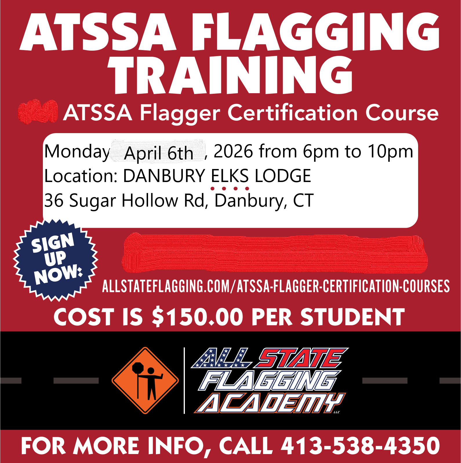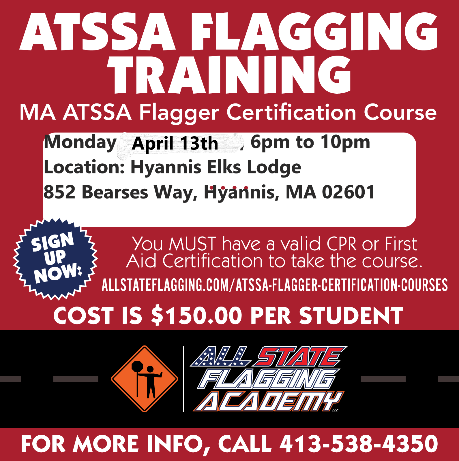 MA ATSSA Flagger Certification Course-Auburn, MA Monday March 30th, 6pm to 10pm Auburn Elks